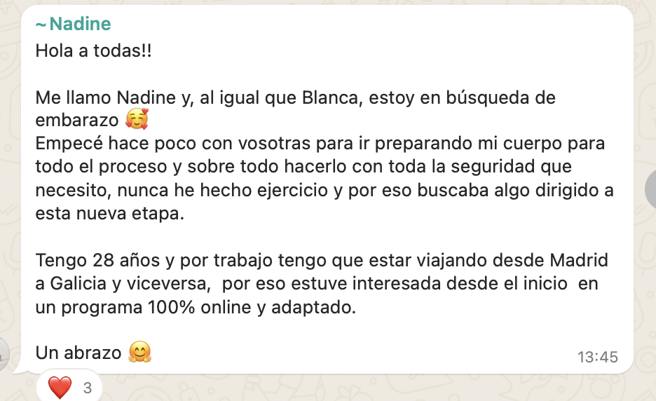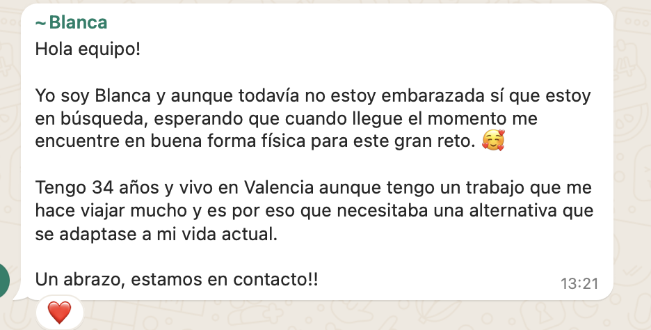 Para ofrecer este nivel de atención, te pedimos un compromiso mínimo de 24 semanas, clave para obtener los mejores resultados. Y si durante estas semanas llega el embarazo, solo tienes que comunicárselo a tu entrenadora y ella adaptará tu plan a tus nuevas circunstancias para que sigas cuidándote a través del ejercicio.